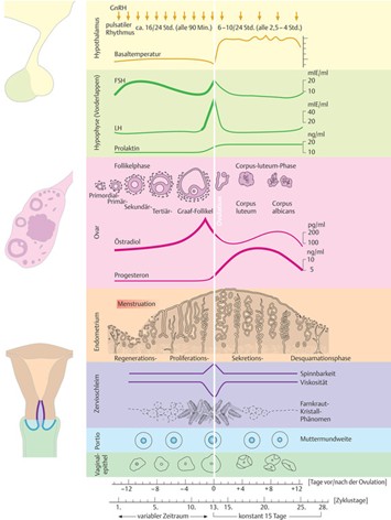 Der Menstruationszyklus dauert im Durchschnitt etwa 28 bis 30 Tage. Er beginnt am ersten Tag der Regelblutung und wird durch ein hochkomplexes Hormonsystem gesteuert.