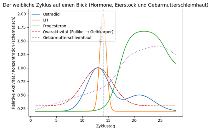 Der weibliche Zyklus wird durch ein fein abgestimmtes Zusammenspiel von Hormonen gesteuert. Während in der ersten Zyklushälfte der Follikel im Eierstock unter dem Einfluss von Östradiol heranreift, löst ein LH-Peak um die Zyklusmitte den Eisprung aus. Danach produziert der Gelbkörper Progesteron, das die Gebärmutterschleimhaut auf eine mögliche Einnistung vorbereitet.